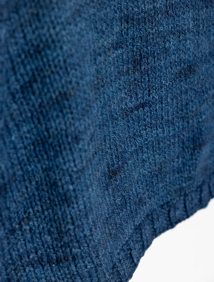 The yarn used is a special hand-spun merino wool sourced from New Zealand. It is scoured using bio-enzymes and then dyed using Indigo and Myrobalan extracted from natural origins from various parts of India. Harvested rainwater heated by solar energy is used at all stages of yarn processing.