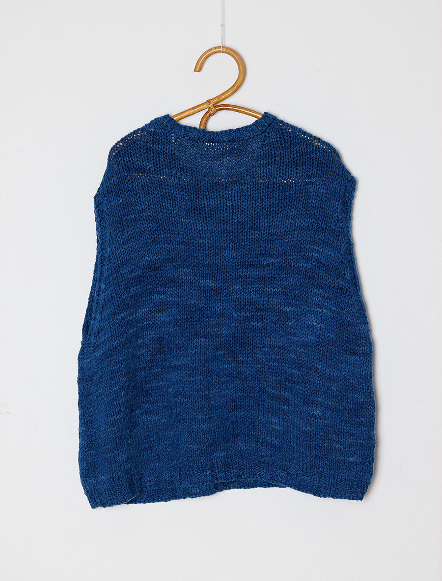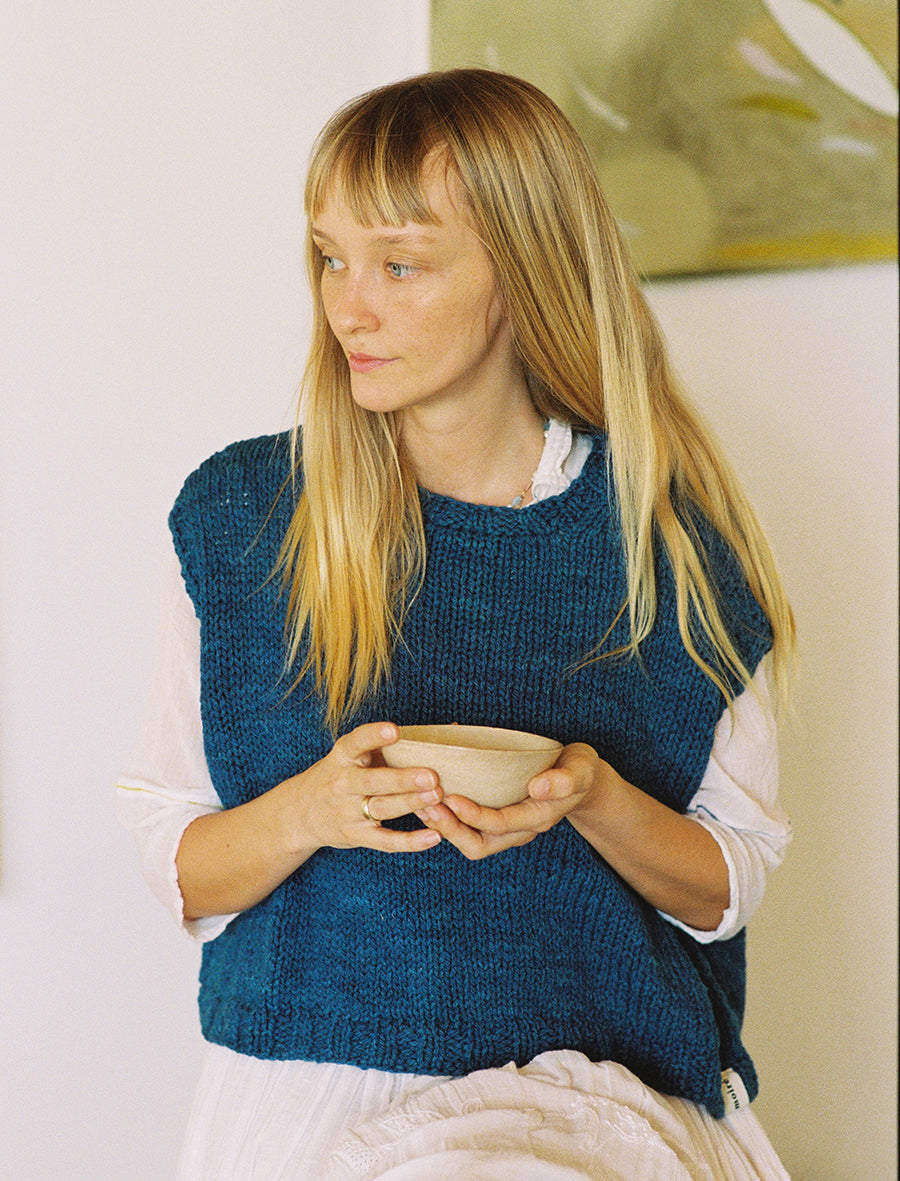 Each vest has been hand-knitted by the same partners who create all of our knitwear. Located at the foothills of the Himalayas in Northern India, these artisan knitters are all women who are able to work from home, allowing them to earn money while caring for their children and families. We love to imagine the hands and hearts who work slowly on these vests, and the stories and vibrant activity that surrounds them as they knit.
