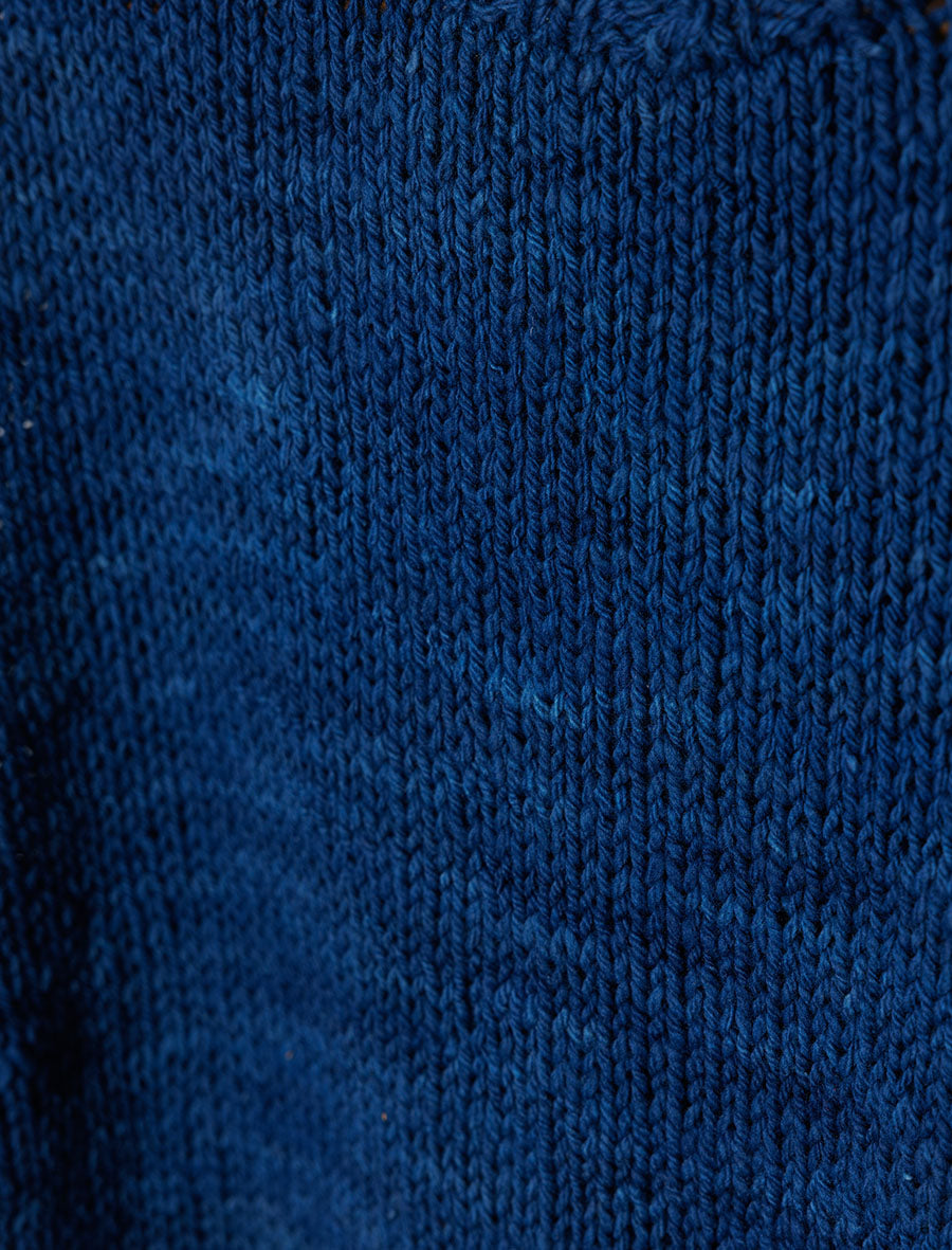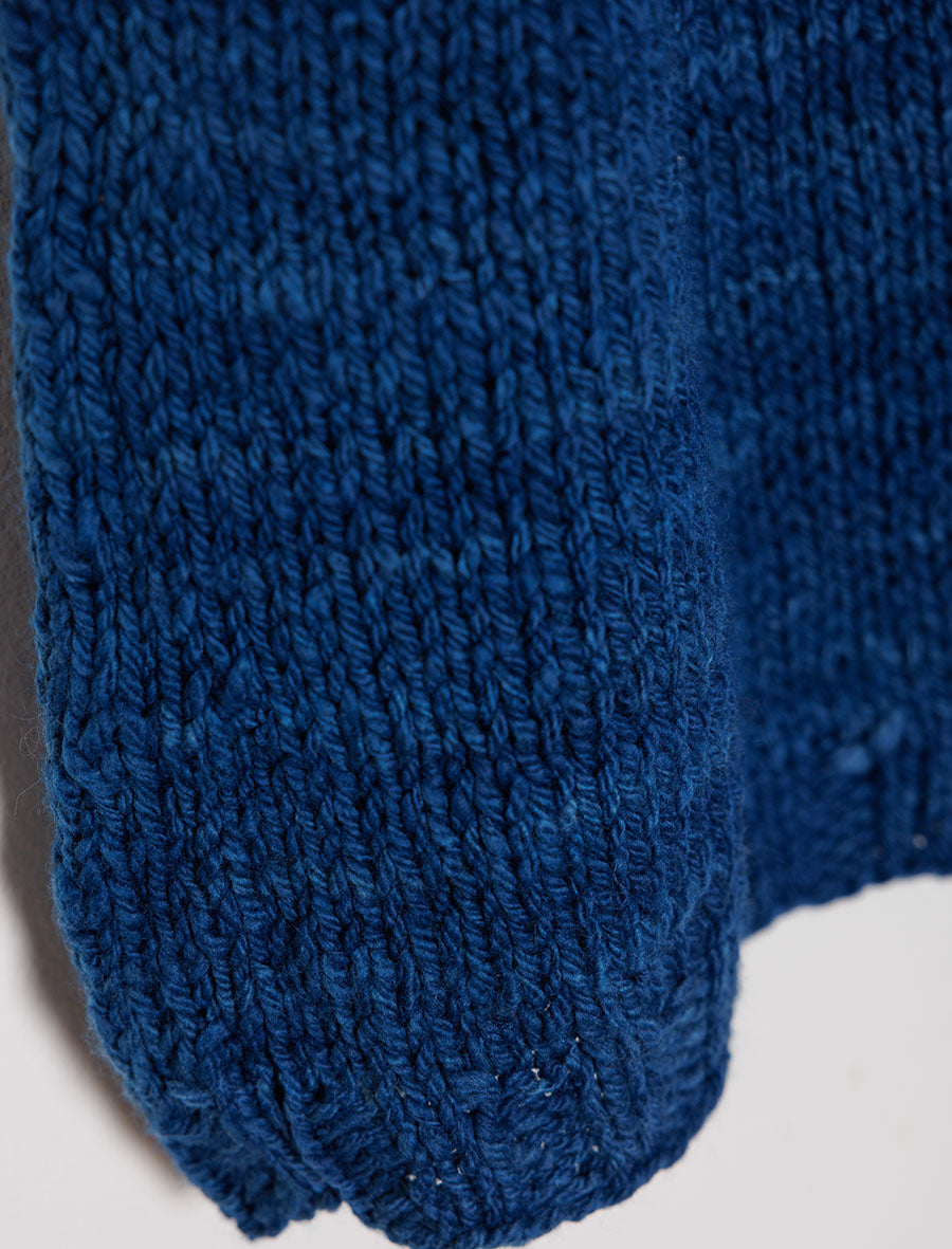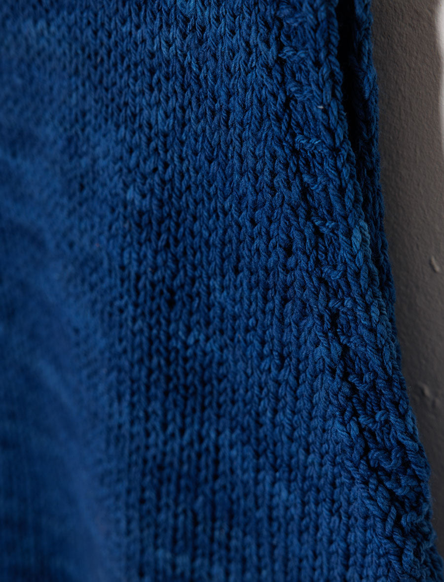 The yarn used is a special hand-spun merino wool sourced from New Zealand. It is scoured using bio-enzymes and then dyed using Indigo extracted from natural origins from various parts of India. Harvested rainwater heated by solar energy is used at all stages of yarn processing.
