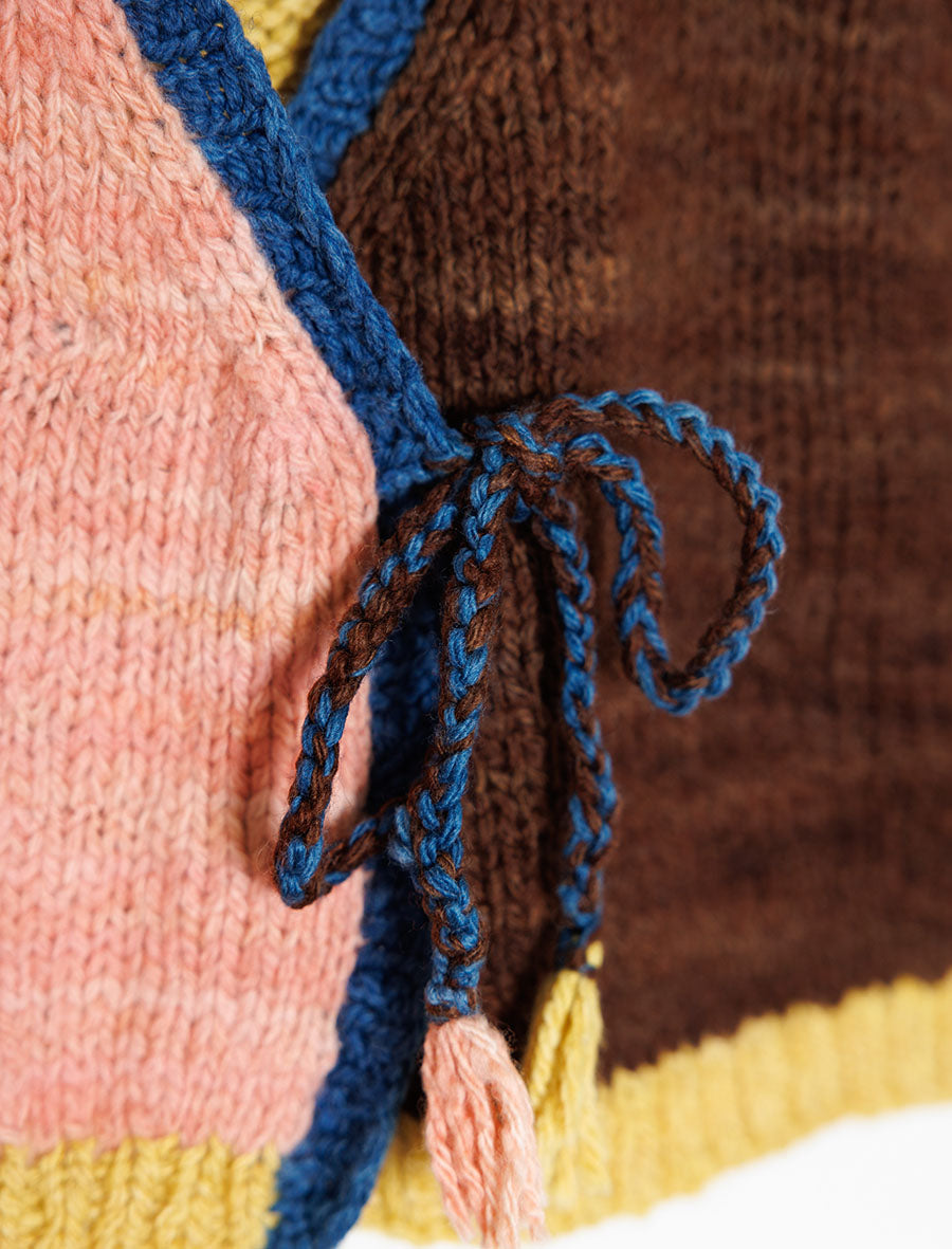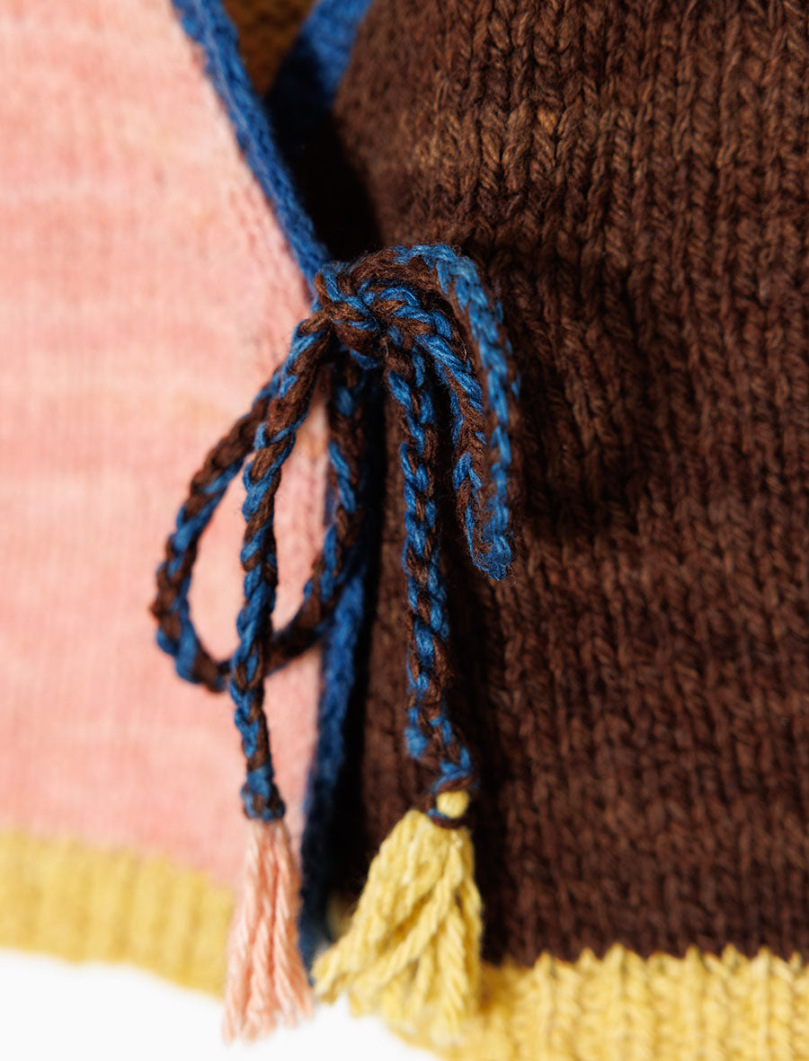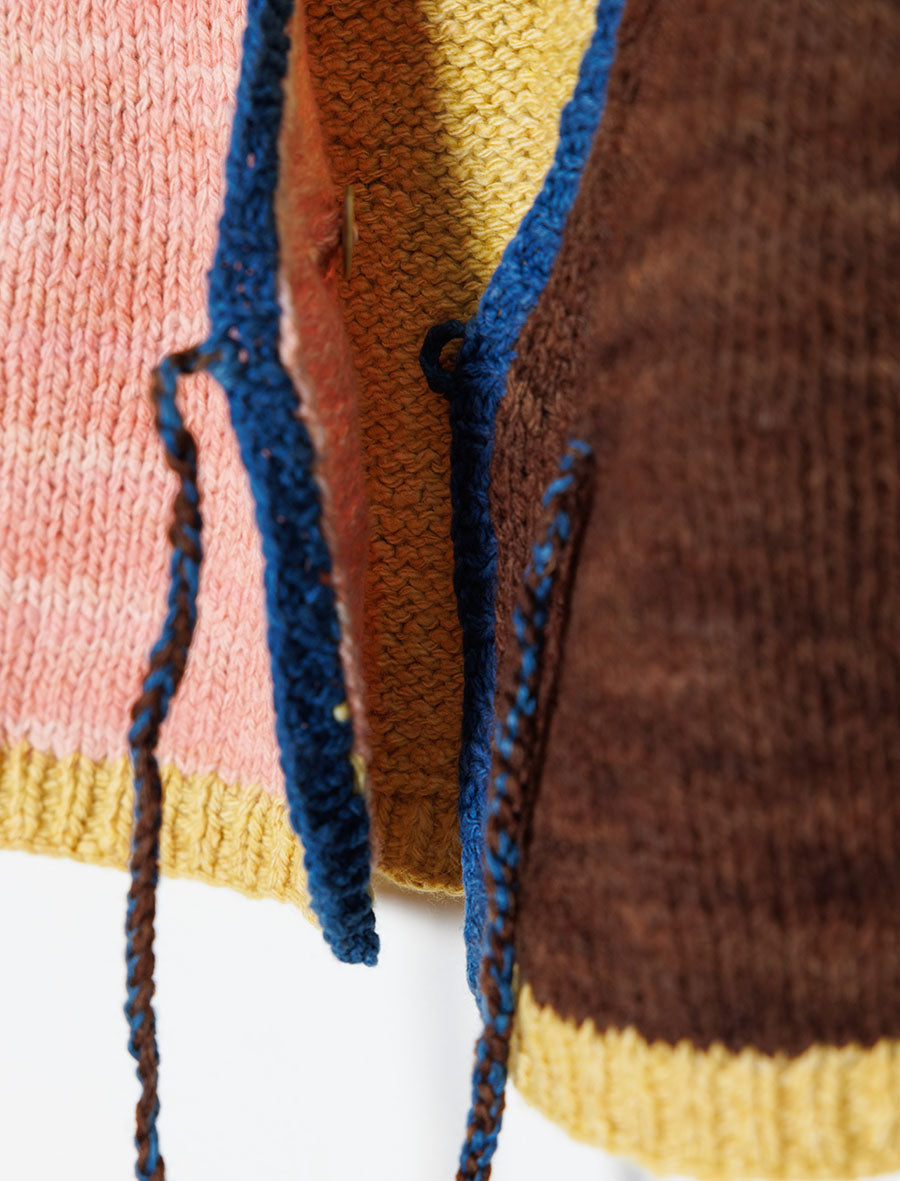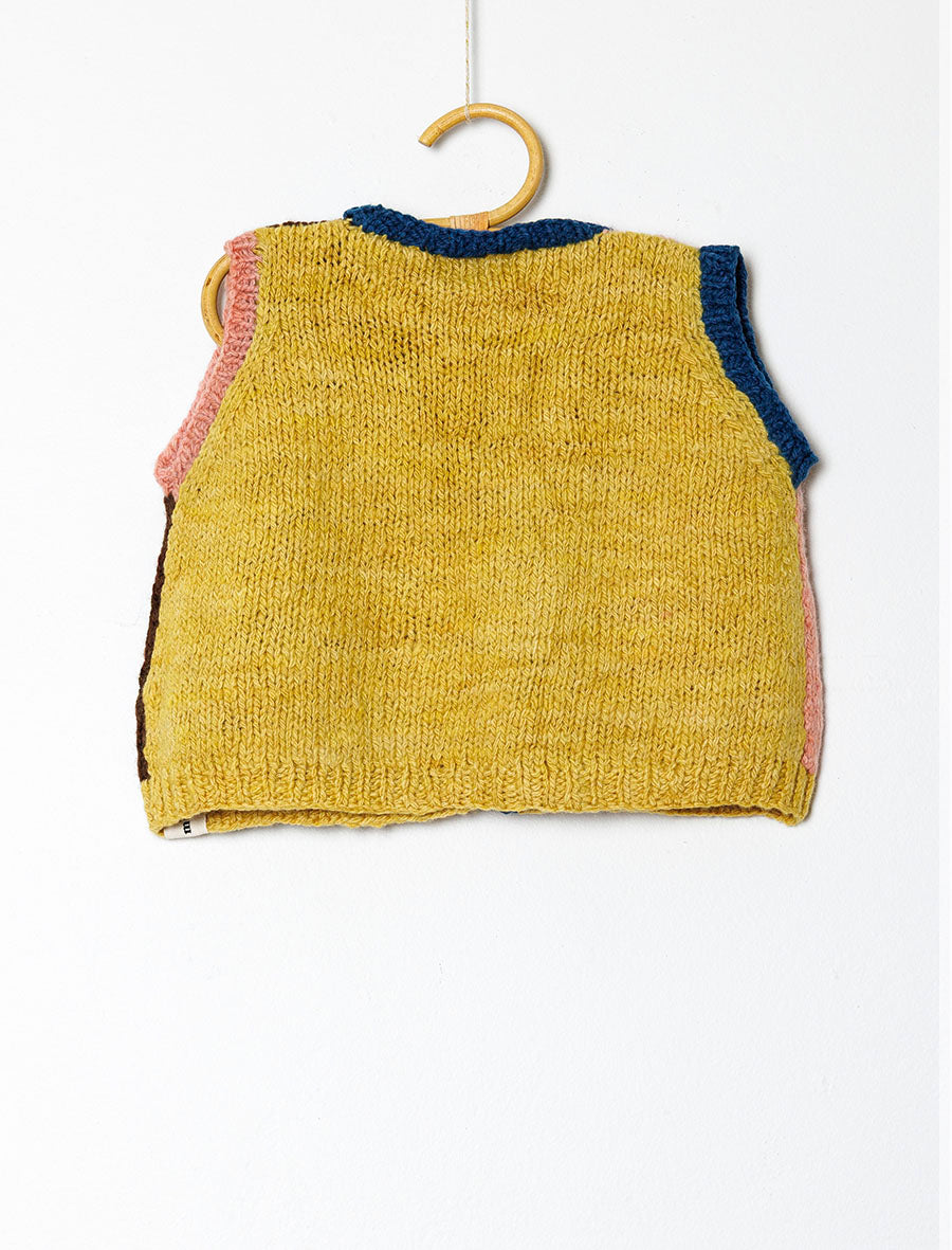 Handknitted by our artisan partners located in the foothills of the Himalayas, this vest has been created with care by women artisans who are often mothers themselves. The yarn used in these vests is a special hand-spun merino wool sourced from New Zealand. It is scoured using bio-enzymes and then then dyed using Sappanwood, Indigo, Kamala, Catechu and Walnut extracted from natural origins from various parts of India.